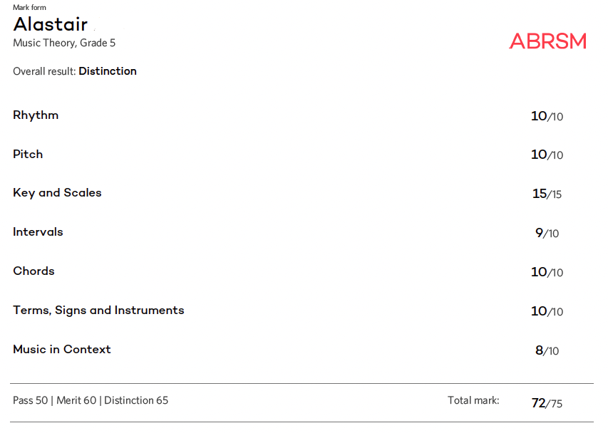 A Pass at Grade 5 Music Theory is required for ABRSM exams in order for you to move onto your higher practical and preformance grades in your chosen instrument (grades 6-8 and beyond).